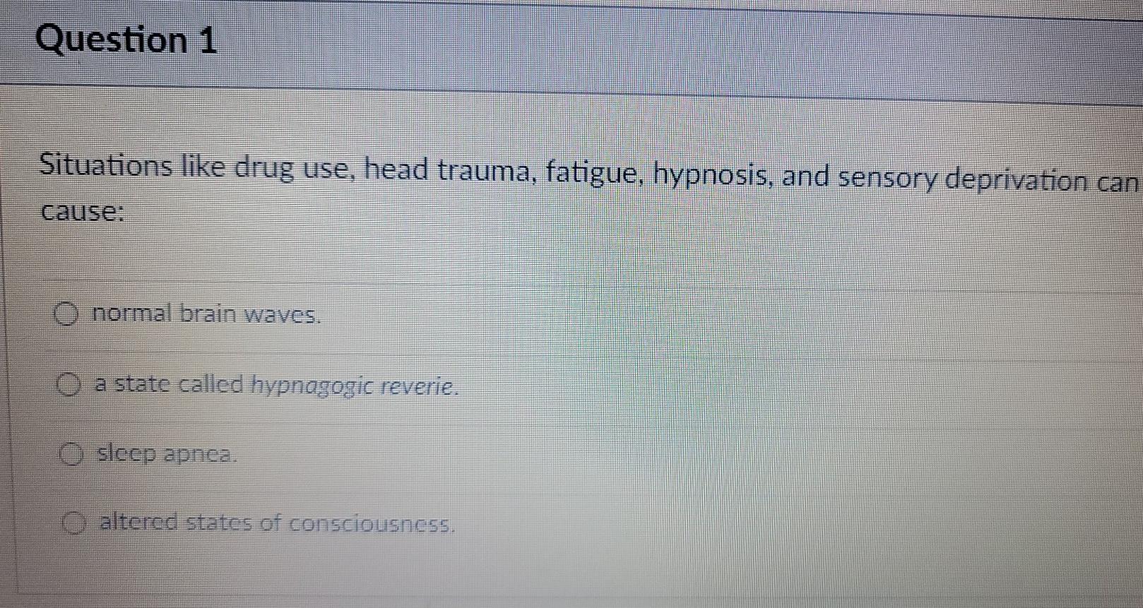 Question 1 Drugs trauma fatigue hypnosis and sensory deprivation produce. Reverie Hypnoanalytic technique based on the theory that free association during the transition from sleep to waking enhances access to unconscious material. Hypnogogic - reverie or dream imagery that happens while falling asleep.